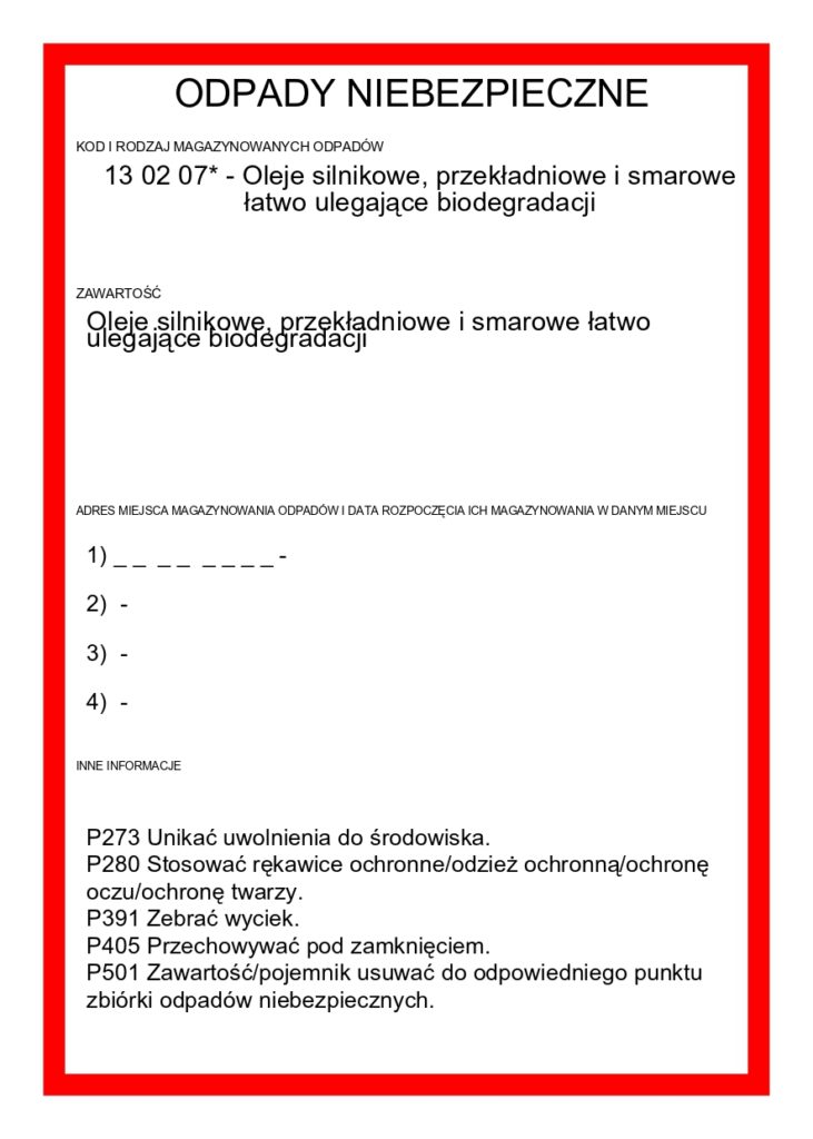 etykiety odpadów niebezpiecznych Etykieta 13 02 07* – Oleje silnikowe, przekładniowe i smarowe łatwo ulegające biodegradacji Wojtek 2025-06-06 Tagi: ADR bezpieczeństwo etykiety klasyfikacja odpadów Odpady odpady niebezpieczne oznaczenia chemiczne oznakowanie transport odpadów Post navigation Previous: Etykieta 13 02 06* – Syntetyczne oleje silnikowe, przekładniowe i smaroweNext: Etykieta 13 02 08* – Inne oleje silnikowe, przekładniowe i smarowe Więcej historii etykiety odpadów niebezpiecznych Generator etykiet na odpady Wojtek 2025-06-17 etykiety odpadów niebezpiecznych Etykiety na odpady — trwałe i zgodne z przepisami Wojtek 2025-06-17 etykiety odpadów niebezpiecznych Etykieta 13 02 08* – Inne oleje silnikowe, przekładniowe i smarowe Wojtek 2025-06-06
